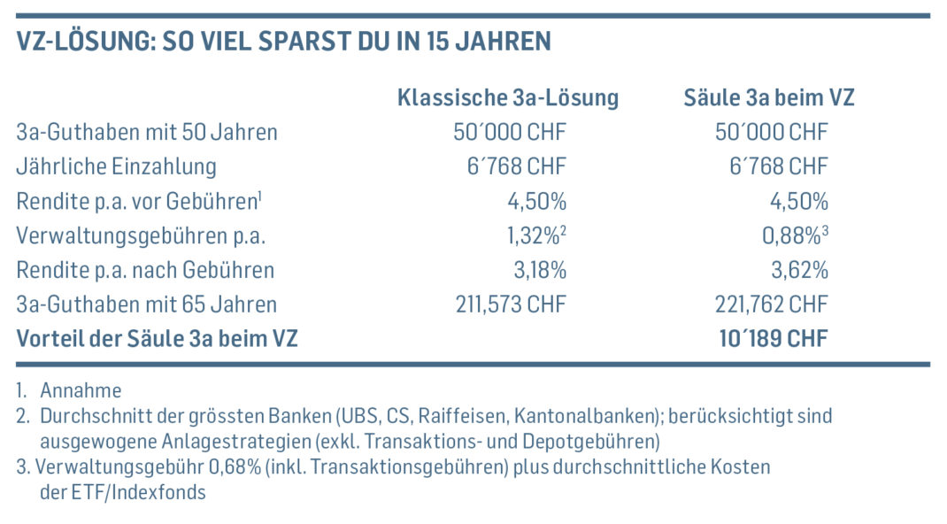 GEBÜHREN SENKEN | Doch aufgepasst: Auch bei 3a-Fonds solltest du immer wieder eine Zwischenbilanz ziehen. Solche Fonds haben oft hohe Kosten für das Fondsmanagement. Der teuerste Fonds kostet bei der CS jährlich 1.45 Prozent, bei der ZKB 1.20 Prozent und bei der UBS sogar 1.72 Prozent. Dazu kommen unter Umständen noch Depot- und Kaufgebühren. All diese Kosten drücken auf deine Rendite.Deutlich günstiger sind dagegen 3a-Wertschriftenlösungen, bei denen dein Guthaben passiv verwaltet wird. Viel Geld sparst du in der Regel mit 3a-Lösungen, die in ETF und Indexfonds investieren. Allein dank der Gebührenersparnis kommen so bis zu deiner Pensionierung mehrere 1‘000 oder 10’000 Franken zusammen (siehe Beispielrechnung in der Tabelle).