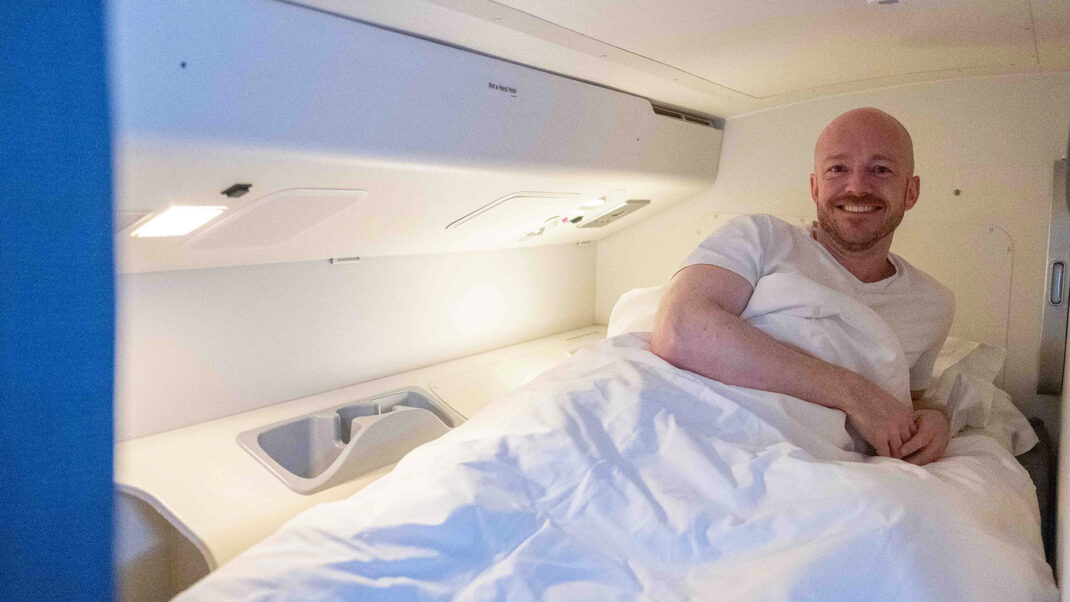 Da der Flug rund elf Stunden dauert, muss jedes Besatzungsmitglied die gesetzlichen Ruhezeiten einhalten. Da Markus die Landung durchführen wird, geht er sich als erstes hinlegen – im Crew Bunk, wo sich ein bequemes Bett befindet.
