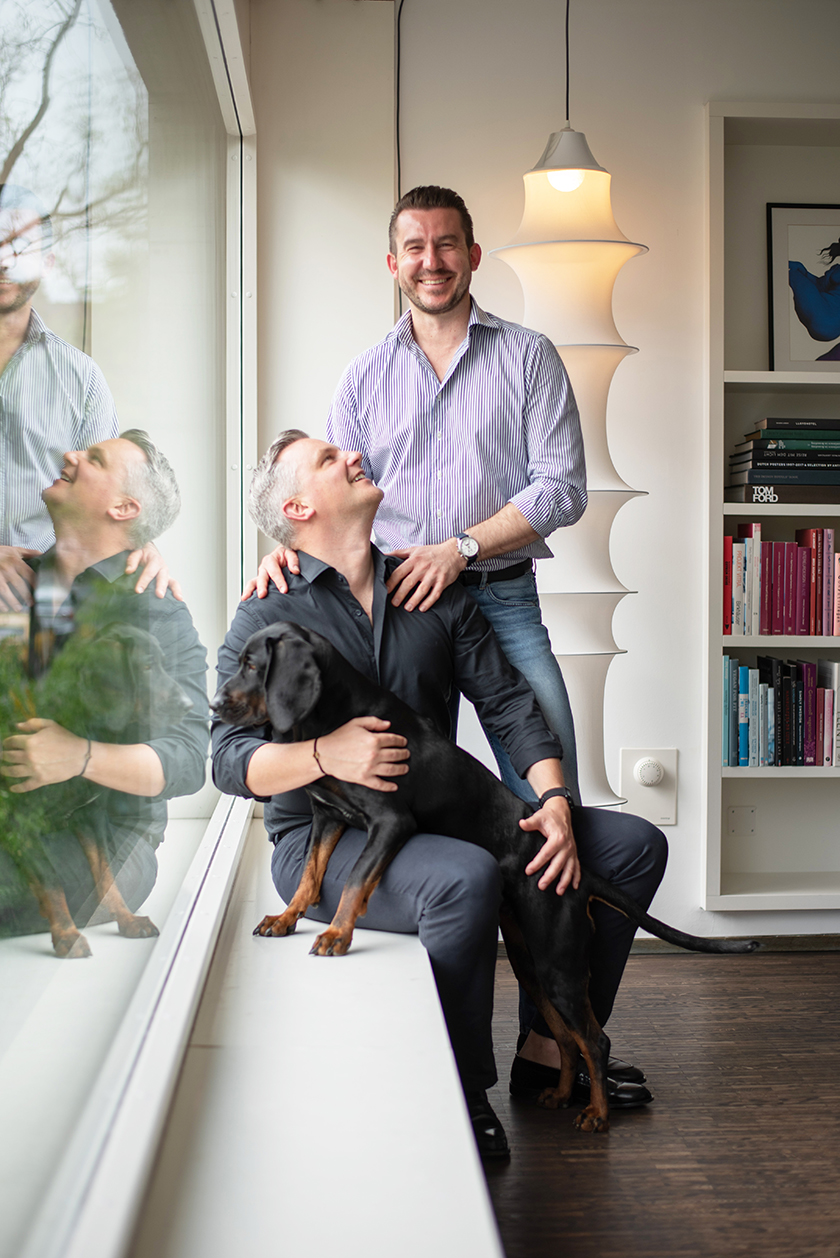 Seit mehr als sieben Jahren ein Paar: Bert Goren und Kamil Klocek. Der 41-jährige Gründer und Besitzer der Firma Skin Euphoria Zürich und sein 42-jähriger Partner leben in einem modernistischen Betonbau unweit der Seilbahn Rigiblick. Die bringt sie in die Höhe auf den Zürichberg, wo sie gern mit Roka spazieren oder joggen gehen.