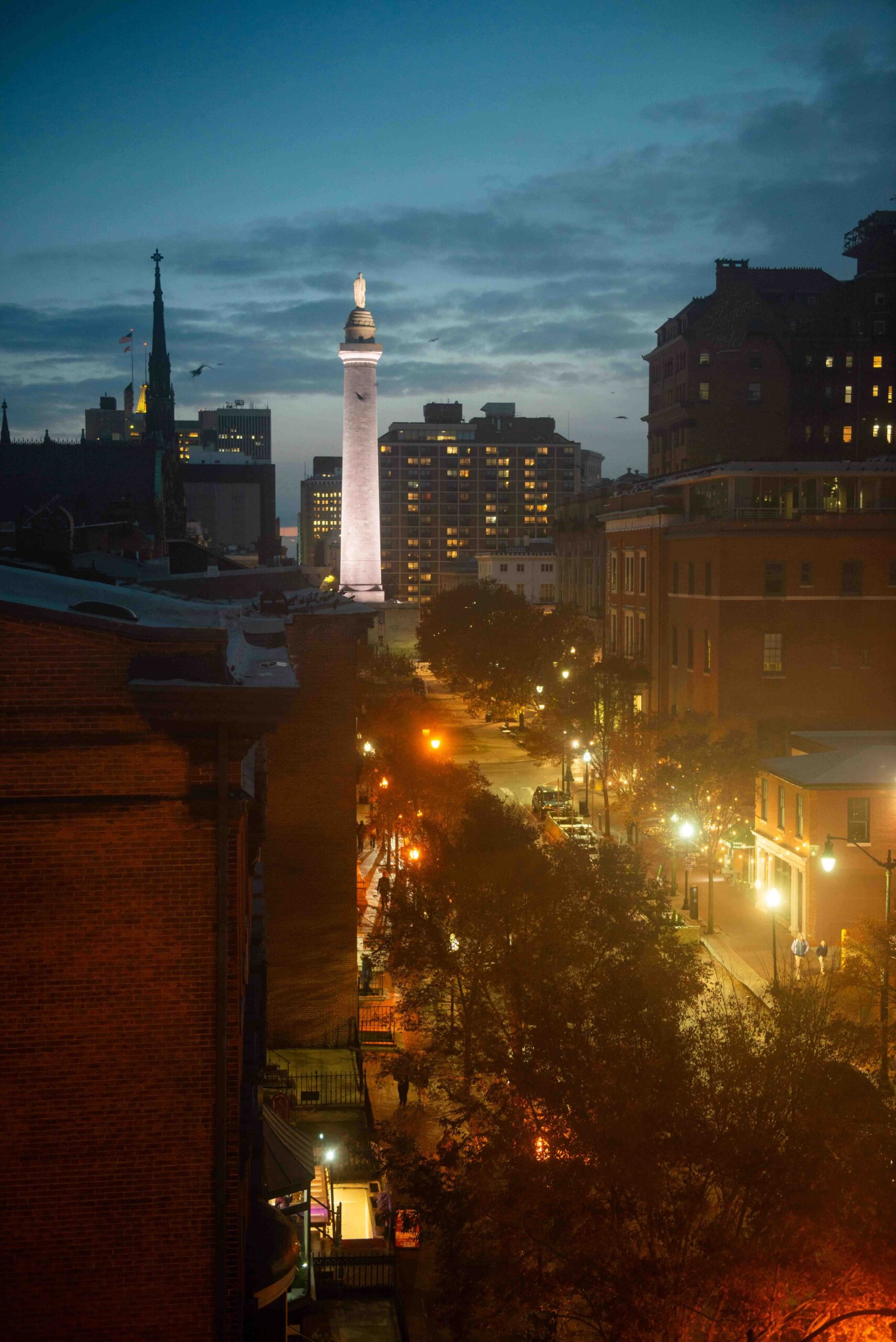 Das Washington Monument am Mount Vernon Place, aus dem Hotelzimmer betrachtet, wirkt wie eine Kulisse aus einem Batman-Movie – ikonisch und voller Atmosphäre.