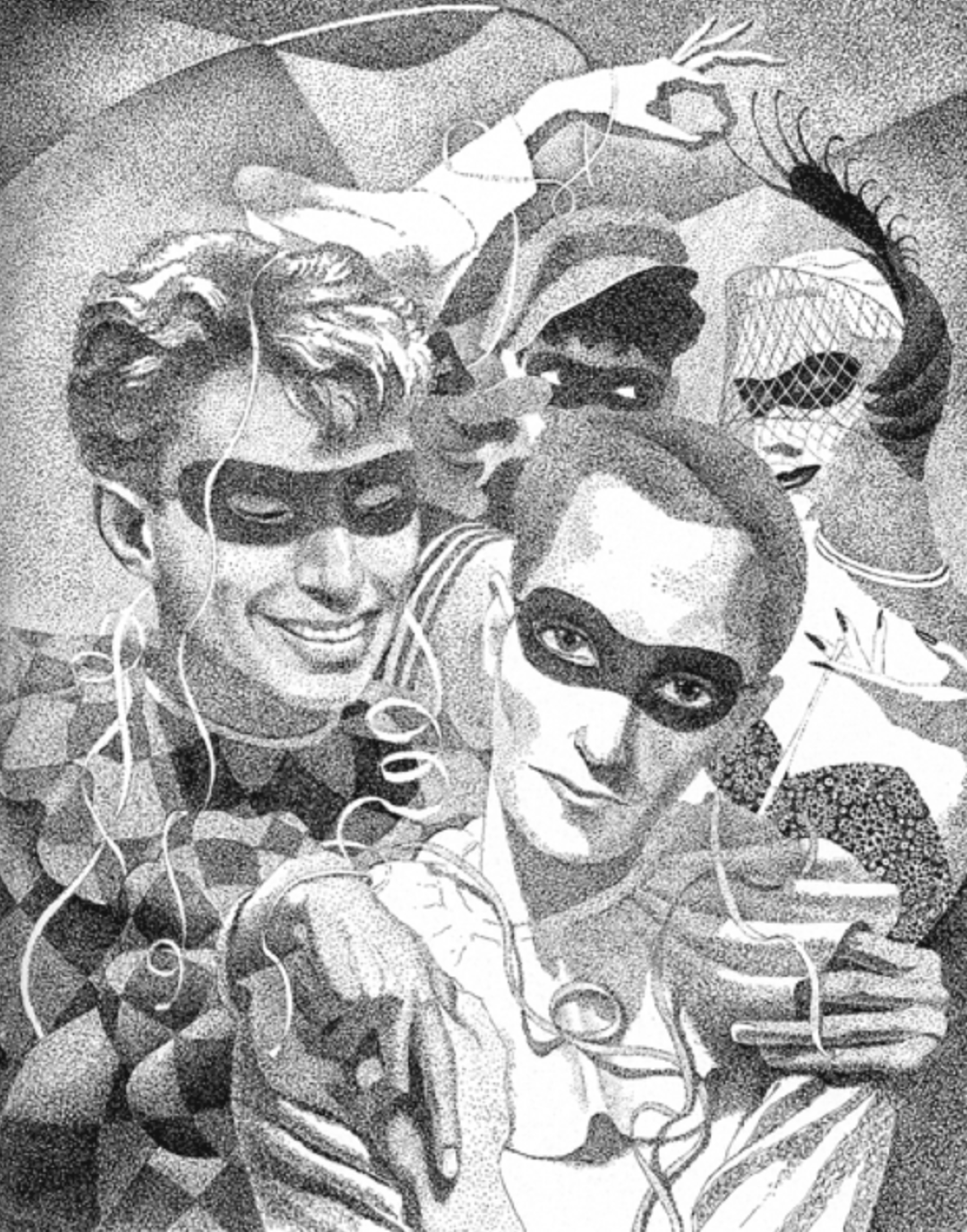 «Maskenball», Federzeichnung von Mario de Graaf, im Magazin «Der Kreis».