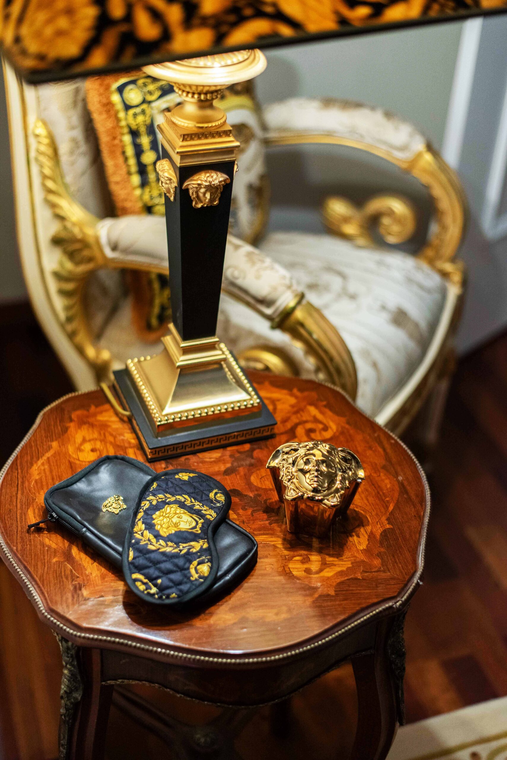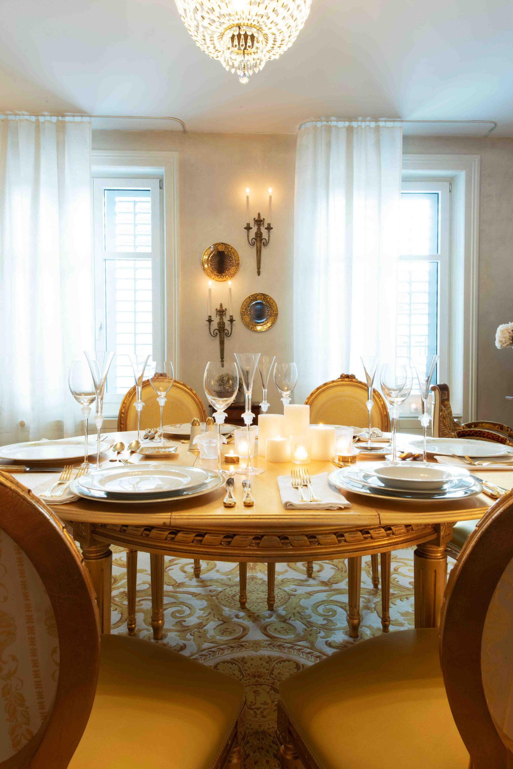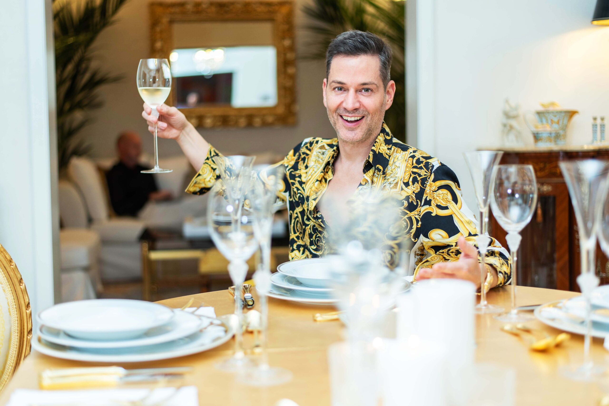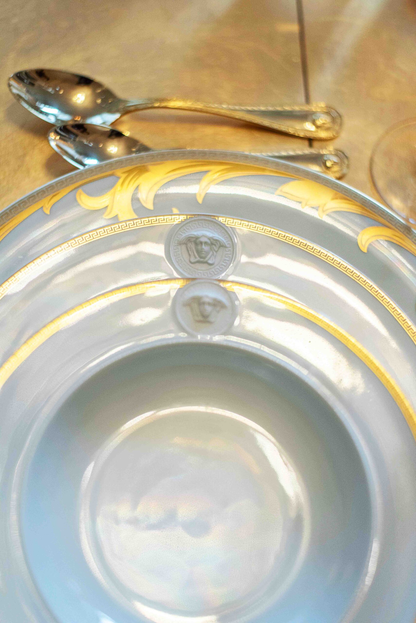 Das Paar liebt es, Partys zu zelebrieren und so sieht es aus, wenn Freunde zu Tisch gebeten werden: Gedeck mit Gold und Medusenhäuptern aus dem Hause Versace Rosenthal. Mit dem Sound der Eighties – vorzugsweise Sandra – ergibt dies das perfekte Dinner.