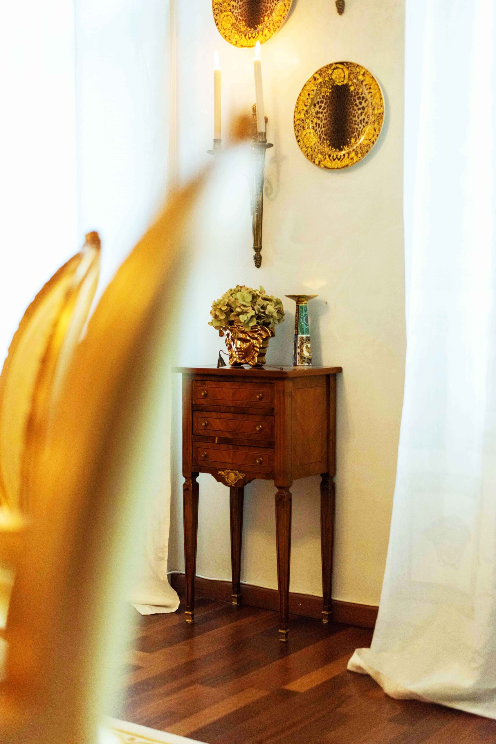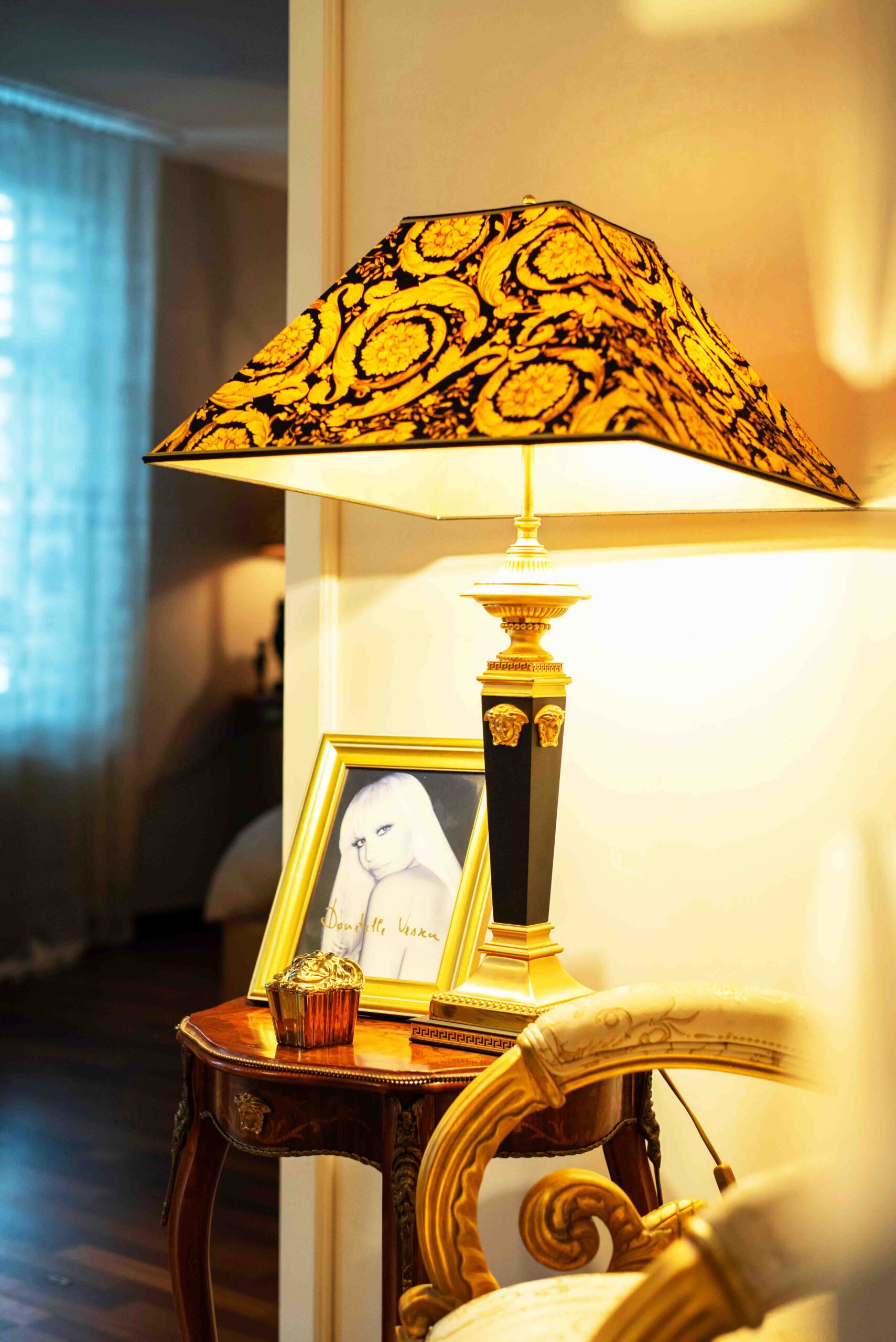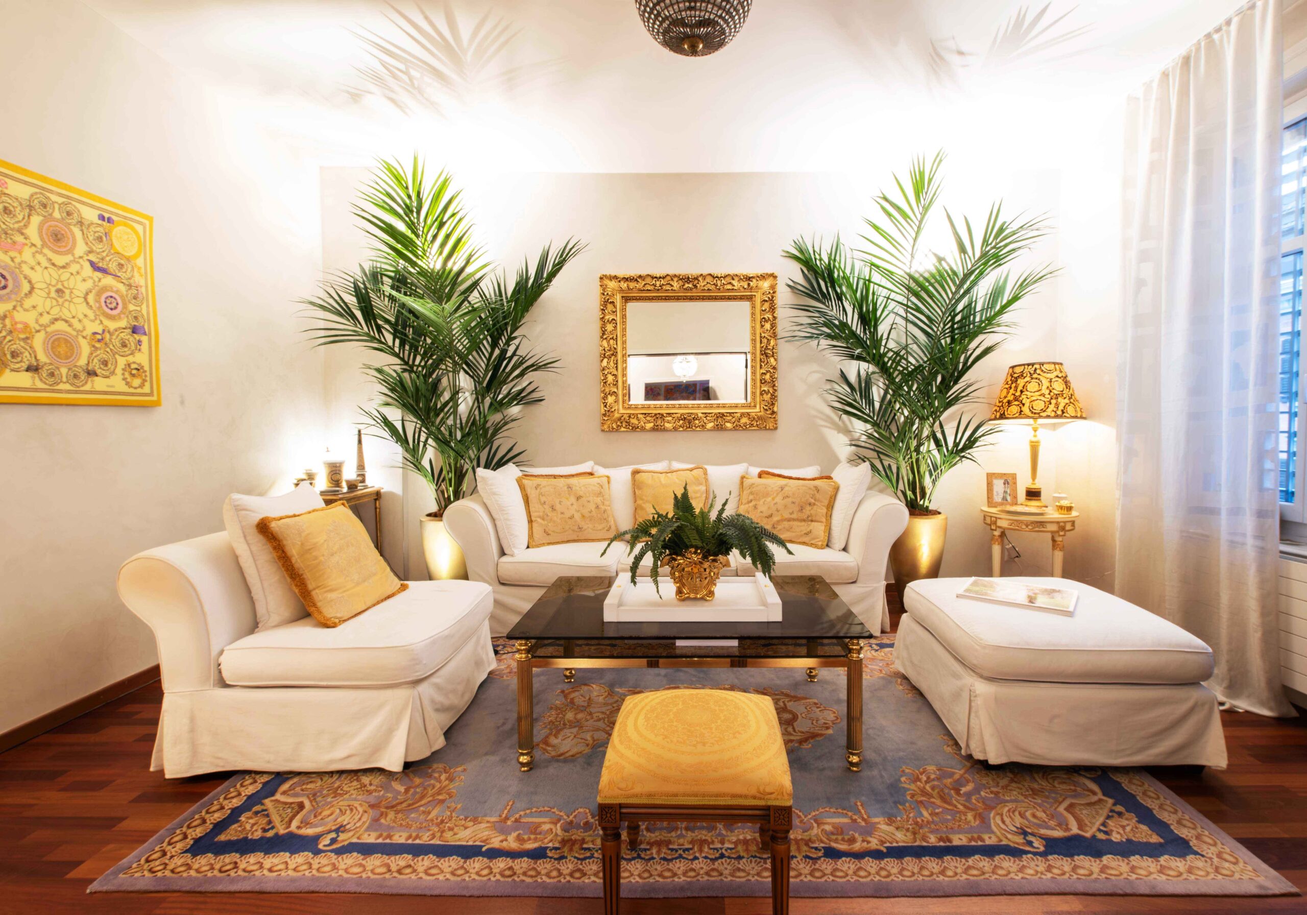 Im letzten Frühling neu gestyltes Wohnzimmer mit Areca-Palmen in vergoldeten Übertöpfen von Mobach. Kissen, Vorhänge, Topf mit Medusenkopf, Beistelltisch und Lampe: Alle Versace. Der Teppich ist von Gianni Versace designed. Den Hocker hat Michael mit einem Versace-Stoff bezogen.