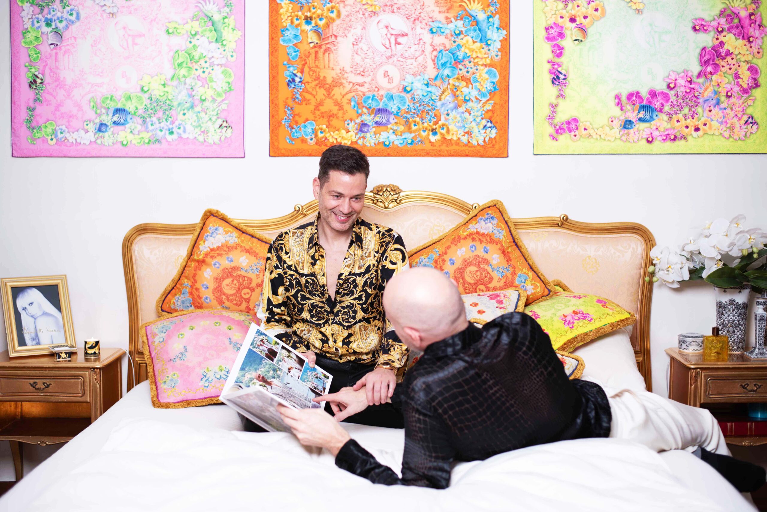 Kissen: Versace. Buch: Hochzeitsalbum von Alf und Michael. Die Versace-Seidenfoulards mit Donatella-Print hat Michael als Bilder aufgespannt.
