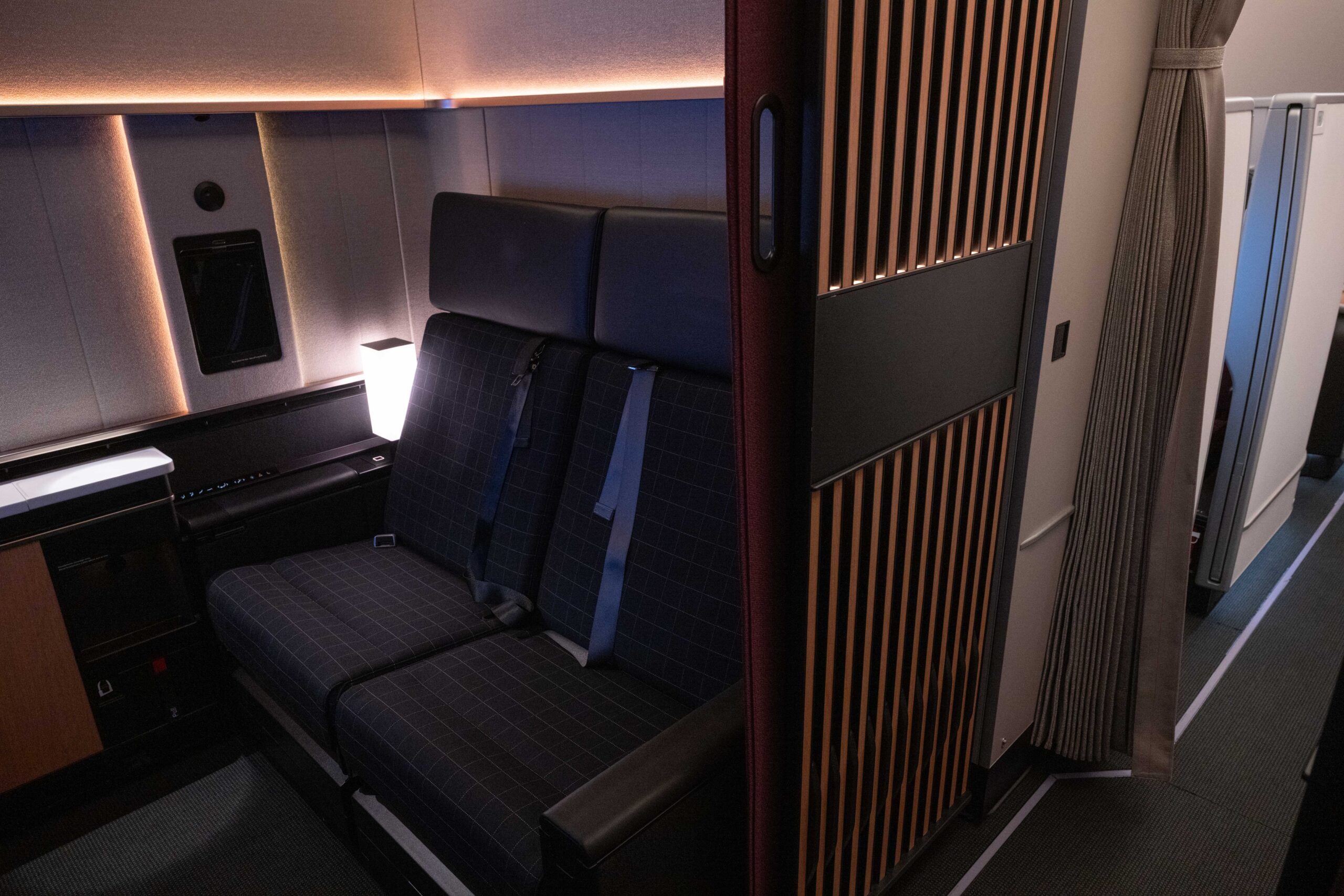 Die Privatsphäre ist enorm. Die Abtrennungen fahren elegant zu, die Materialien sind warm und strukturiert. Nichts wirkt protzig, alles wirkt bewusst stilvoll. Die Couple-Suite ist so exklusiv, dass sie nur telefonisch gebucht werden kann.